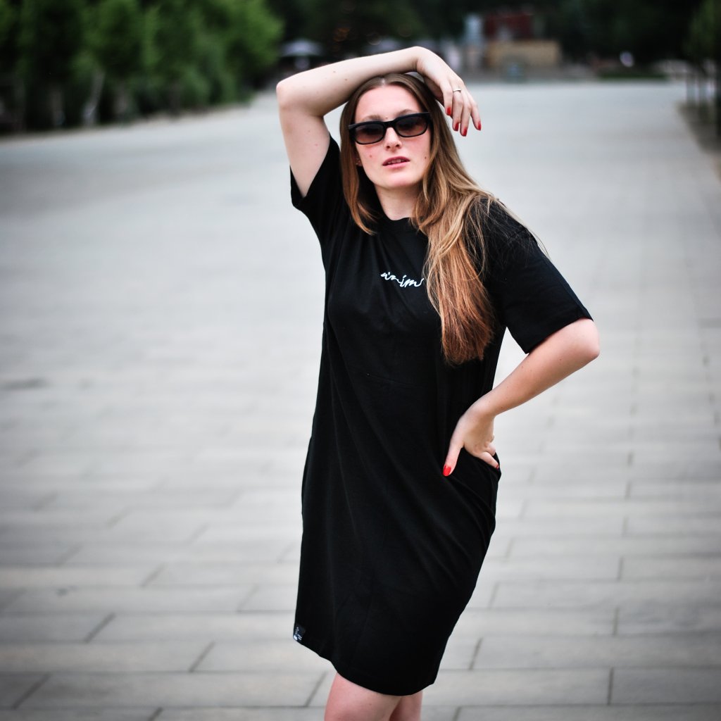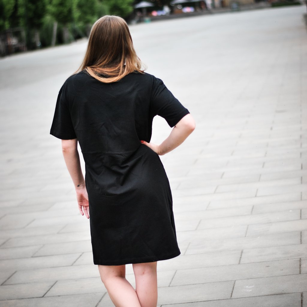 Dlouhý boční rozparek. Spadlá ramena, kulatý výstřih. Dělící šev v pase pro tvarování. Oversized střih.
